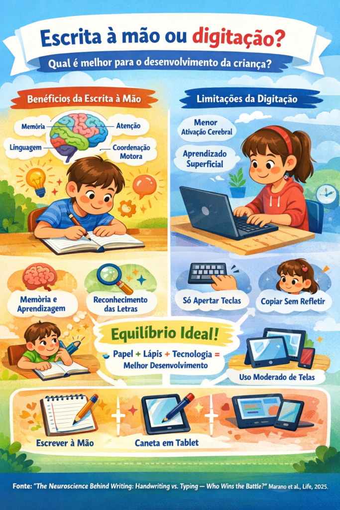 Estudos de neuroimagem mostram que, ao escrever à mão, a criança ativa mais áreas do cérebro do que quando digita, especialmente regiões ligadas à aprendizagem, memória e linguagem. Isso acontece porque formar cada letra exige planejamento motor, controle dos dedos e integração com o que os olhos veem.